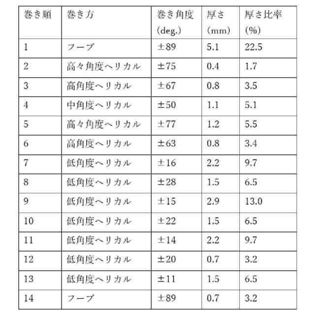 繊維強化樹脂層において、ライナの軸に対する繊維の巻き角度が、