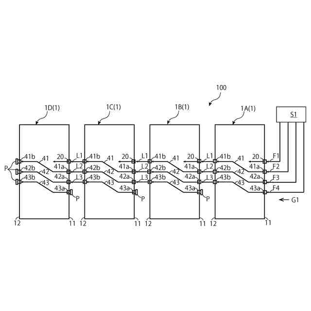 この省スペースを実現するために、図7(b)に概念的に示すように、縦列に配列した複数のガス供給装置6A~6D内を順に通過する一本の通過配管(渡し配管)6sを設け、各ガス供給装置6A~6D内で分岐(ワンドロップ)して、そのガス供給装置6にガスを供給する方式(渡し配管方式)が考えられる。しかし、この図7(b)の方式では、1本の渡し配管6sを使用するので、ガスの供給容量が十分でないという問題がある。渡し配管6sを大径化することにより容量を増やすことが考えられるが、そうすると施工が困難であるという問題がある。