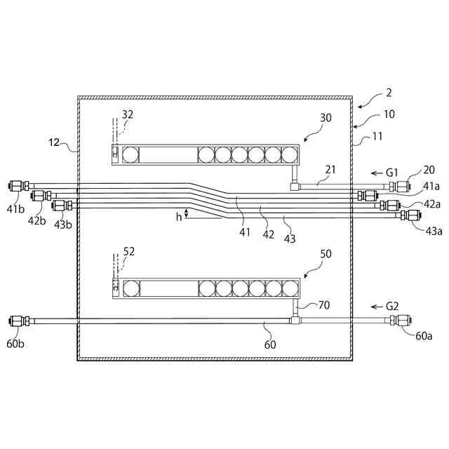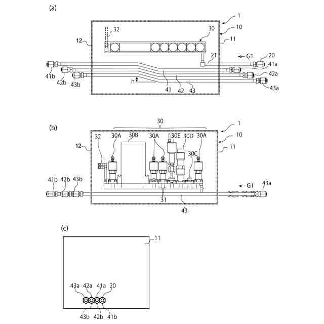 また、図7(c)に概念的に示す、縦列に配列した複数のガス供給装置7A~7D内を通過する、複数の並列の通過配管7a~7dを設け、目的のガス供給装置7にガスを供給する方式も考えられる。これにより、供給容量の確保とある程度の省スペース化とを両立できる。しかし、この方式では、ガス供給装置7A~7Dを一方向に揃えて配置すると、上流側のガス供給装置7と、下流側のガス供給装置7の間で、そのガス供給装置7に供給する配管の接続位置が異なるため、上流側のガス供給装置7と下流側のガス供給装置7でガス供給装置7の部品の共通化ができないという問題がある。特にガス供給装置7内部の配管をヒータで加熱する仕様の場合、この方式では、ガス供給装置7によってヒータの形状も変わるため、温度調節にばらつきが出るという問題がある。