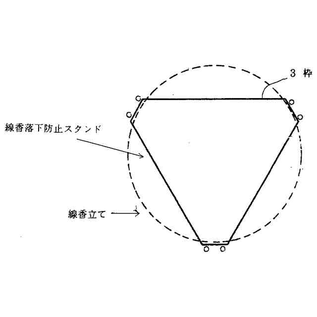 線香立て外周にスタンドを置くだけで線香立てより上に設けた輪、枠が線香の倒れ、落下を防止でき線香の落下火災を防ぐ。正面からの違和感を除くため細い線材、三本足構造とした。線香の火は[図3]に示すように金属製の輪、枠と接触すると線香の火は消える。輪、枠からの下の線香は消えた線香になり安全。