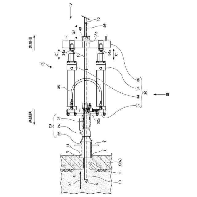 静的コーン試験は地上からの調査を対象としていることから、杭打ち機をベースに改良したベースマシンを地上に設置して試験装置を構成するのが一般的である。この試験装置では、先端にプローブを備えているロッドをベースマシンに装備されたハンマーヘッドに取り付け、ハンマーヘッドによってロッドを地盤に圧入する際に、例えば5乃至8tもの貫入力(土質によって様々に変化する)が生じ、この貫入力に抗するべく、地盤に対してベースマシンをスクリューアンカー(アンカーの一例)にて固定する措置が講じられている。