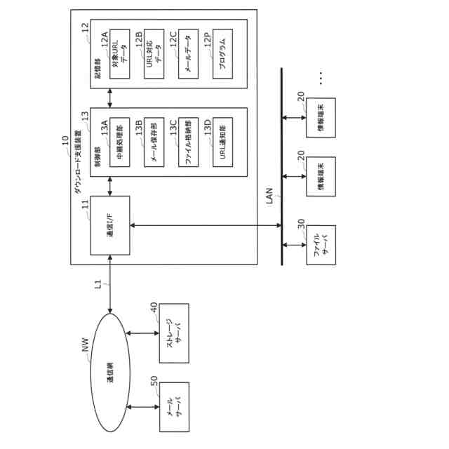 このような目的を達成するために、本発明にかかるダウンロード支援装置は、情報端末が受信したメールにストレージサーバにおけるファイルのURLが記載されている場合に、前記ファイルのダウンロードを支援するダウンロード支援装置であって、前記情報端末から送信された第1のダウンロード要求に応じて、前記第1のダウンロード要求で指定された第1の要求URLに対応するファイルが前記ストレージサーバからダウンロードされた場合、前記ファイルを抽出してファイルサーバに格納するとともに、前記第1の要求URLと前記ファイルの格納先を示す格納URLとを関連付けて記憶部に格納するように構成されたファイル格納部と、前記情報端末から送信された第2のダウンロード要求に応じて、前記ストレージサーバからエラーが返送された場合、前記第2のダウンロード要求で指定された第2の要求URLと関連付けられている前記格納URLを前記記憶部から取得し、前記情報端末に通知するように構成されたURL通知部とを備える。