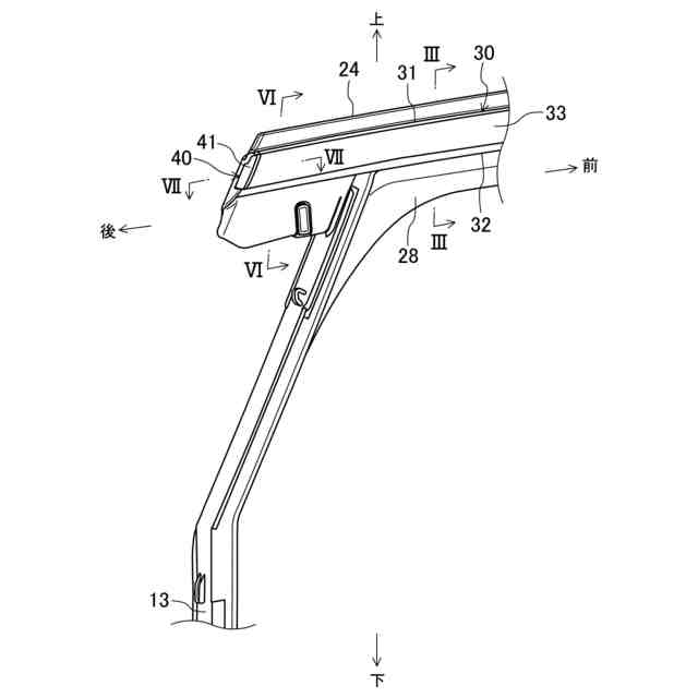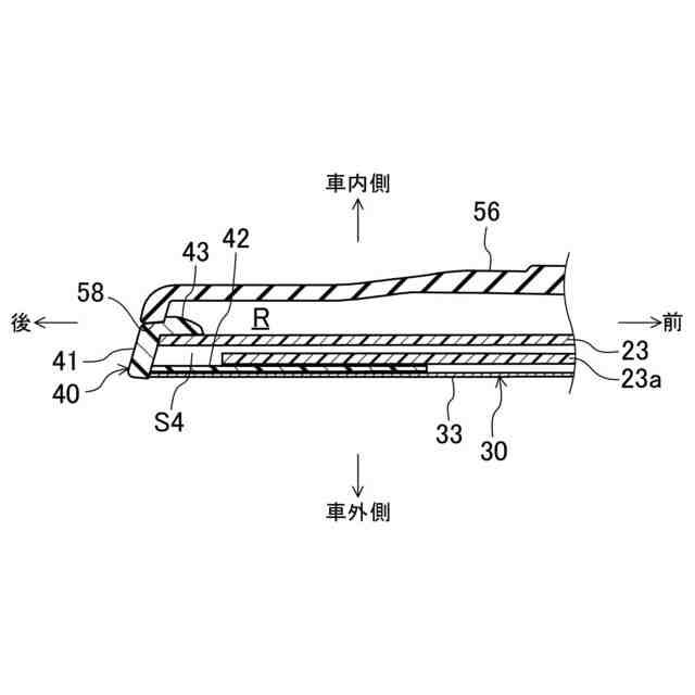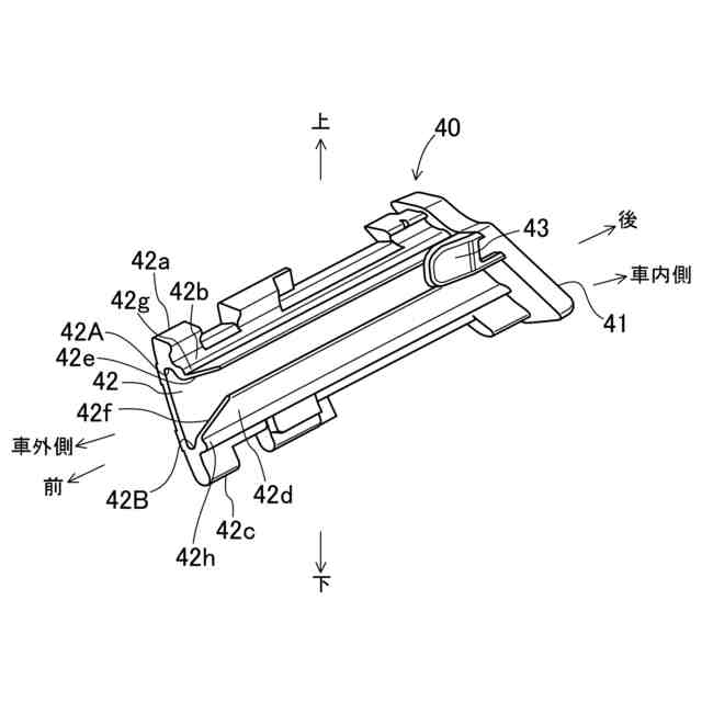 前記上側溝は、前記固定板の上側部分と、前記固定板の上部から上方へ突出する上側突出部と、前記上側突出部の車内側から下方へ突出する上部内側突出部とによって形成され、