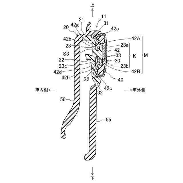 一方、後側モール106は車体に固定されていて、後側モール106の前端部は、正規の位置にあるリヤドアモール102aの後端部と同じ高さになるように配置されるので、上にずれてしまっているリヤドアモール102aの後端部との間に段差ができることになる。このことは車両の外観見栄えの悪化をもたらすことになる。