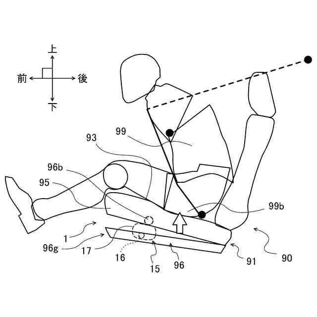 ところで、例えば特許文献1に紹介されているような従来型のシートクッションエアバッグが作動しても、衝撃発生時には乗員は前方に移動する。発生した衝撃が大きい場合には、乗員が前方に大きく移動する。この場合には、乗員の胸部がシートベルトによって後方に向けて相対的に強く押され、乗員に大きな負担がかかる虞がある。