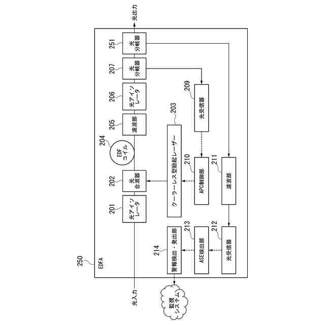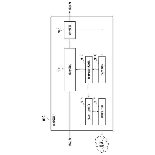 図6は、上記のような光増幅技術を内蔵した光増幅器910の構成例を示す図である。光増幅器910の光増幅部911は、光増幅器910への光入力信号を、駆動電流供給部912から供給される駆動電流を利用して光増幅技術により増幅し、出力する。光増幅部911の出力側には光分岐器913が配置される。光分岐器913により2つに分岐された一方は、光増幅器910からの光出力信号となり、他方は、光分岐器913の後に配置された光受信部914に出力される。光受信部914は、光分岐器913から入力した光出力信号を検出し、得られた光出力信号強度情報を駆動電流供給部912にフィードバックする。これにより、出力光信号のパワーを一定に保つ(APC:Auto Power Control)等の制御を行うのが一般的である。一方、監視・検出部915は、駆動電流供給部912における駆動電流量を監視し、異常値を検出した場合には、警報発出部916を経由して異常情報を監視システムに送信する。ここで、異常情報をもとに、光増幅器910の動作を停止する等の制御を行うこともある。