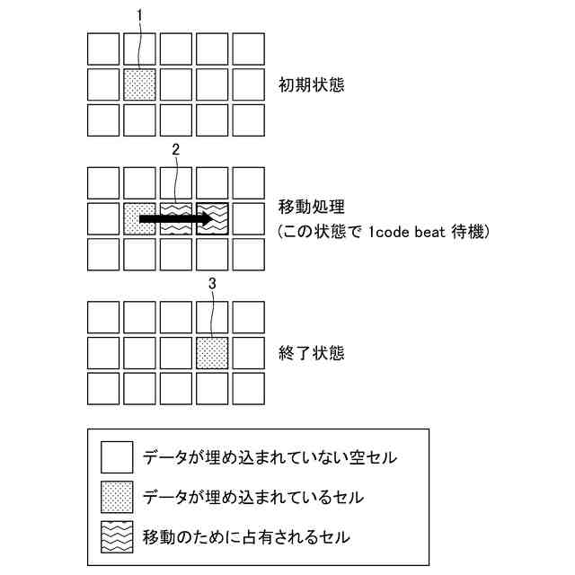 現在、代表的な量子誤り訂正では二次元格子状に並んだセルに平面上の量子ビットの領域を分割し、それぞれのセルが1量子ビットを符号化可能な領域とする抽象化を行うことが一般的である(非特許文献1~4)。この時、データ(情報)が埋め込まれているセルをデータセル、埋め込まれていないセルを空きセルと呼ぶことにする。