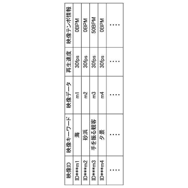 カラオケ演奏に合わせて表示手段に表示させる背景映像を構成する複数の映像を識別するための映像識別情報、当該映像のイメージを示す映像キーワード、当該映像識別情報に対応する映像を表示させるための映像データ、当該映像を再生する際の再生速度、及び当該映像からテンポが認識できる場合には当該テンポの値を示し、当該映像からテンポが認識できない場合には0の値を示す映像テンポ情報を対応付けて記憶する映像記憶部と、