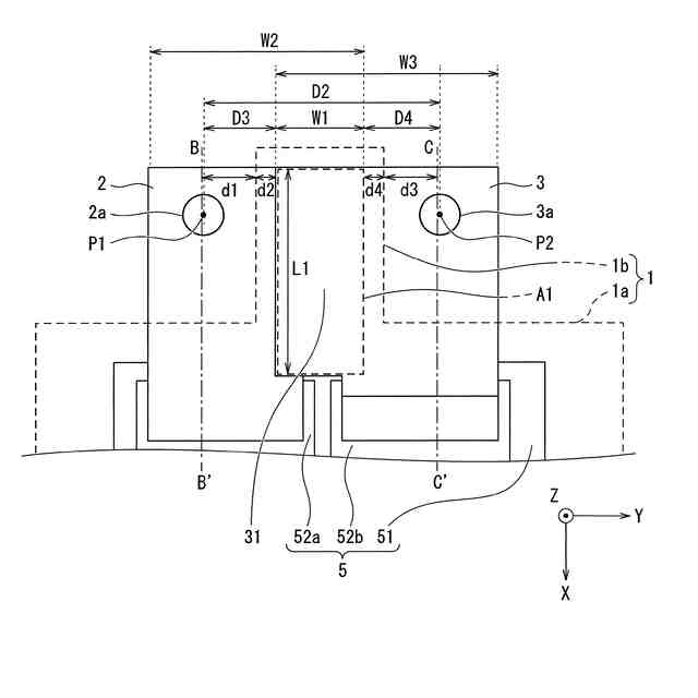 前記第1端子及び前記第2端子が、前記第1接続部と前記第2接続部との間で互いに離隔して対向する矩形状の対向部をそれぞれ有し、