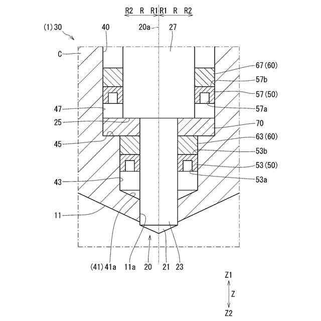 【解決手段】ラム20は、通路40に差し込まれ、混合室11に対して接近または離反するように、通路40に沿った方向である通路方向Zに移動することで通路40を開閉する。シール50は、ラム20が通路40を閉じた状態のときのラム20の外面と通路40の内面との間に配置され、シール開口部53aと、シール背面部53bと、を備える。シール開口部53aは、シール50の混合室側Z2部分に設けられる。シール背面部53bは、シール50の反混合室側Z1の面である。バックアップ部60は、シール背面部53bに接触し、シール50を反混合室側Z1から支持する。
