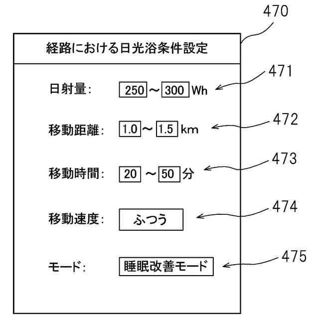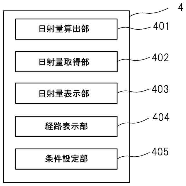 前記経路の算出の際に参照される条件として、前記経路推定日射量の範囲、移動距離の範囲、移動時間の範囲、及び移動速度の目安のいずれかを設定する条件設定部を更に備え、