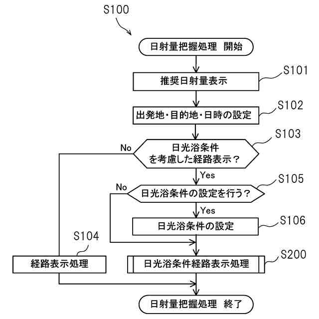 前記日射量算出部は、前記経路の途中である現在地を取得し、前記現在地から前記目的地までの複数の経路のそれぞれにおいて浴びる日射量である複数の現在地経路推定日射量を算出し、