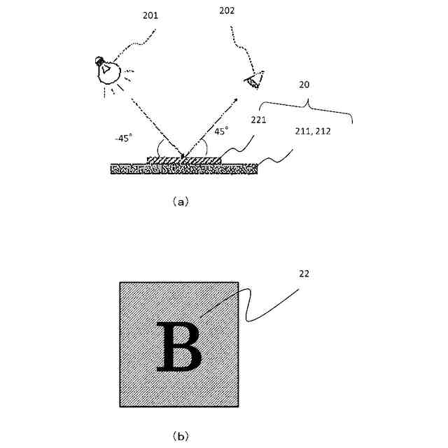 印刷模様の光輝性画像を可視化する方法を説明するための模式図である。