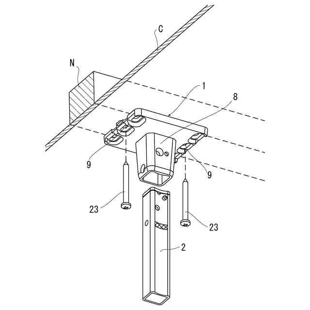 第一実施例の支持具を天井面に取り付ける状態を示す分解斜視図(野縁Nに取り付ける場合)。