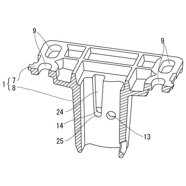 支持具1は、略四角形板状の基板部7の表面中央部に角筒状の筒状部8を立設して成り、基板部7には前後部にそれぞれ3つづつの取付孔9・・・9を設け、筒状部8には、正面板下部に取付孔12を、内側面板中程部に取付孔13を、その横隣部に操作窓14をそれぞれ設けてある。