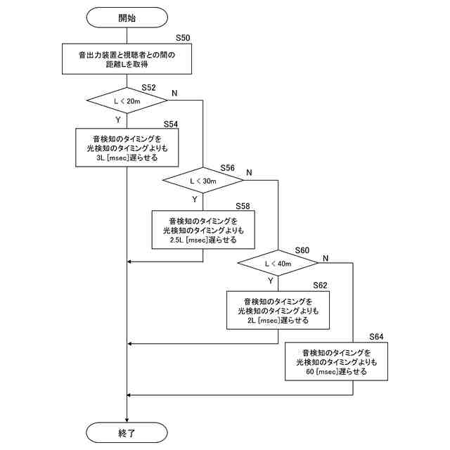 しかし、音と光との出力タイミングのずれの原因は、1つの装置内でのデータ処理の時間差によるものには限られない。例えば、会場に設置される音響設備および映像設備のそれぞれは、互いにデータ通信可能に接続された複数の装置によって構成されることがある。また、これらの音響設備および映像設備のそれぞれを構成する装置は、会場ごとに異なる場合がある。このような音響設備および映像設備のそれぞれを構成する装置間のデータ通信の時間差などによっても、音と光との出力タイミングのずれが生じ得る。さらに、出力された音および光のそれぞれが視聴者に到達するまでの時間差も影響し得る。音響設備および映像設備を構成するたびに、これらの影響を考慮して音と光との出力タイミングを調整することは困難である。