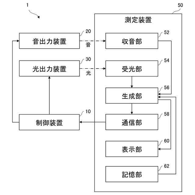 前記出力音および前記出力光を検知する測定装置と、を備え、