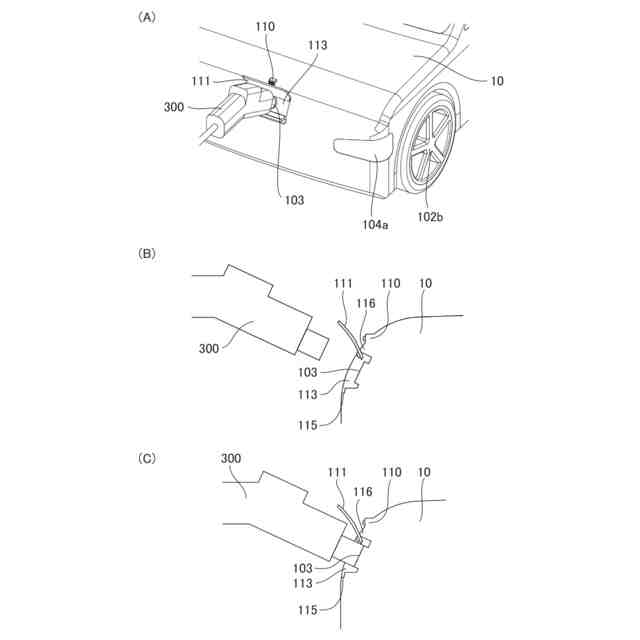 (A)は充電時の状態の例を示す部分斜視図、(B)は充電プラグ300を充電ポート103に接続する直前の内部断面の例を示す図、(C)は充電プラグ300を充電ポート103に接続した後の内部断面の例を示す図である。