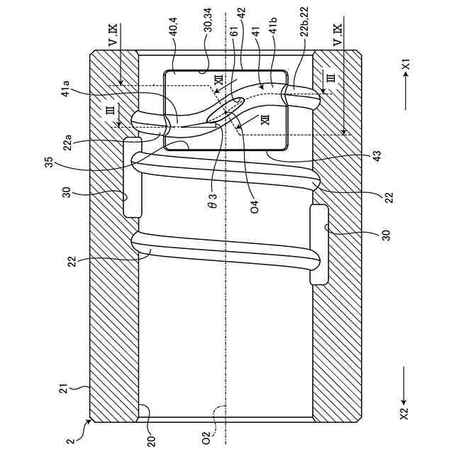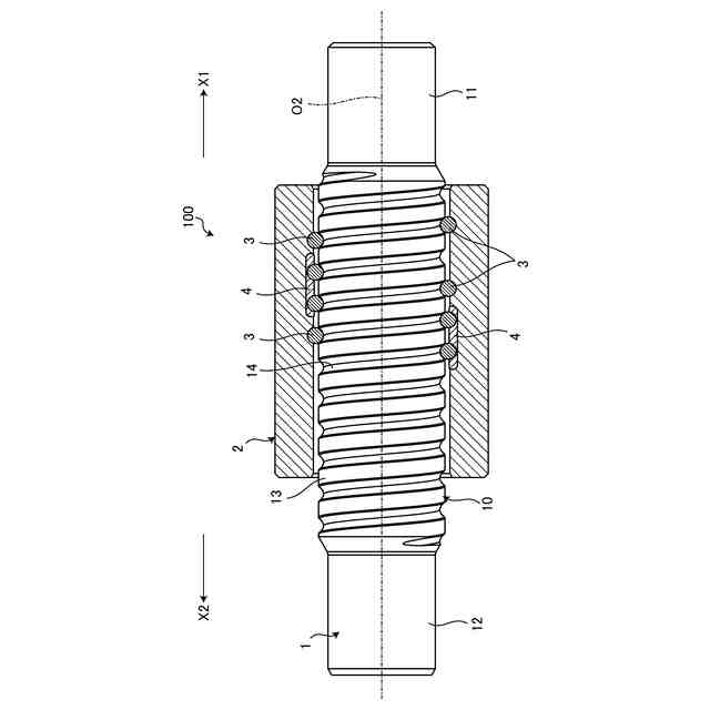 従来のコマは、S字溝面の長さ方向の全てに底壁部が設けられている。一方、本開示のコマは、貫通孔により底壁部の一部が切り欠かれる。よって、コマが径方向に小型化する。また、貫通孔により切り欠かれる底壁部の一部は、S字溝面の長さ方向の中央部に対し、径方向外側に配置される部分である。S字溝面は、長さ方向の中央部に近づくにつれて径方向外側に配置される。よって、貫通孔により切り欠かれる底壁部の一部は、径方向の厚みが小さく肉薄部となっている。射出成形で樹脂製のコマを製造する場合、肉薄部が樹脂の流動性の低下を招く。この結果、コマが所定の形状に成形されなかったり、強度不足となったりする可能性がある。一方、本開示によれば、樹脂の流動性の低下の原因となる肉薄部が切り欠かれている。よって、仮に射出成形で樹脂製のコマを製造しても、所定の形状に成形されなかったり、強度不足となったりすることが回避される。また、本開示のコマによれば、ナットの外周面に貫通孔を設ける必要がない。このため、ナットの外周面を摺動させてナット自体をピストンとして機能させたり、又はナットの外周面に軸受、モータのロータ、減速ギヤ、及びベルトプーリ等などを直接圧入させたりする要望(ニーズ)に対応できる。さらに、ナットの外周面に貫通孔がないため、防塵性が高い。または、ナットの外周面に貫通孔が設けられ、さらに貫通孔を閉塞する部品が設けられた場合と比べて、本開示のナットが小型化及び軽量化している。