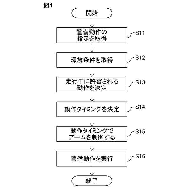 警備動作の実行にあたってアームのポジションを遷移させる際、ロボットの周囲の人物等へ危険が及び得るため、安全性に配慮したアーム遷移を行う必要があり時間を要してしまう。そこで、アームを有する自律走行ロボットの運用において、効率的に警備動作を実行しながら、安全性に配慮することが求められる。