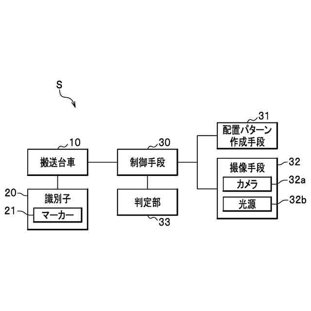 前記の目的を達成するために、本発明に係る搬送装置は、物品を乗せつつ、搬送経路に沿って移動する複数の搬送台車と、該搬送台車の側面に設置される識別子と、該識別子を読み取り、該搬送台車の識別を行う制御手段と、を備え、該識別子は、該搬送台車毎に設定された識別パターンに対応して配置される複数のマーカーを備えることを特徴とする。