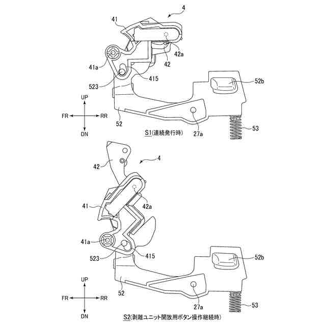 連続発行時と剥離ユニット開放用ボタン操作時において、剥離ユニット開放用レバーと剥離ユニットの関係を説明する図である。