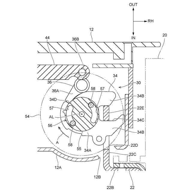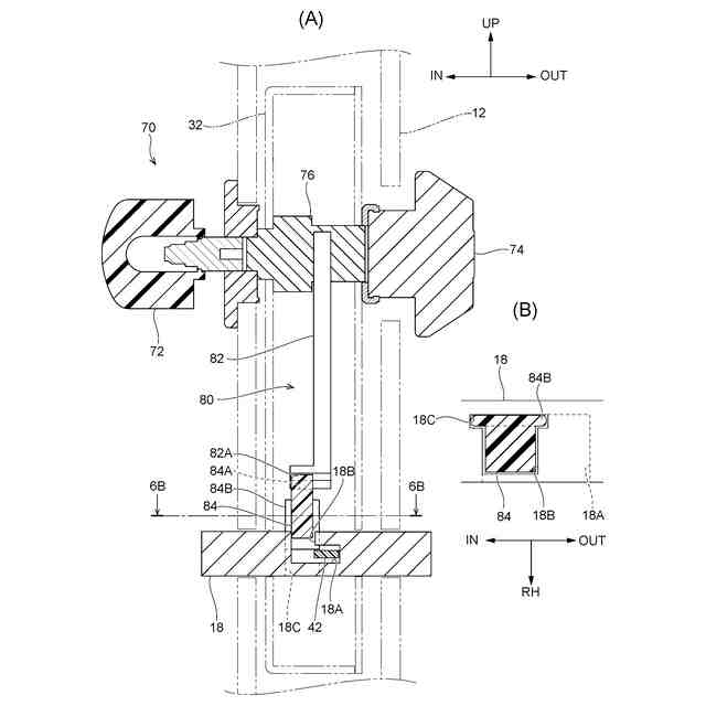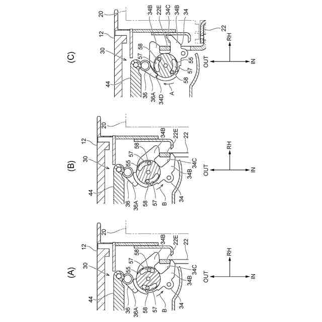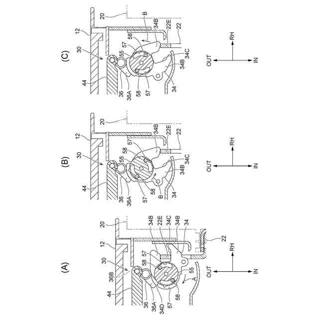 (A)は、図8(C)に示されるフォークレバーが回転方向他方側へ回転してハーフラッチ位置に配置された状態を示す断面図であり、(B)は、(A)に示されるクローレバーが回転方向他方側へ回転してクローレバーとフォークレバーとが回転方向他方側へ一体回転可能に係合した状態を示す断面図であり、(C)は、(B)に示されるクローレバー及びフォークレバーが回転方向他方側へ回転してラッチ位置に配置された状態を示す断面図である。