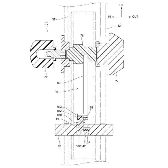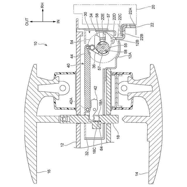 なお、以下の説明では、便宜上、ドア12を閉じた位置(閉位置)に配置した状態で説明する。また、図面において適宜示される、矢印INは室内側を示し、矢印OUTは室外側を示している。以下の説明では、矢印IN及び矢印OUTの方向を、見込み方向という。また、図面において適宜示される、矢印UPは、上側(垂直方向一方側)を示しており、矢印RHは、室外側から見た右側(水平方向一方側)を示している。