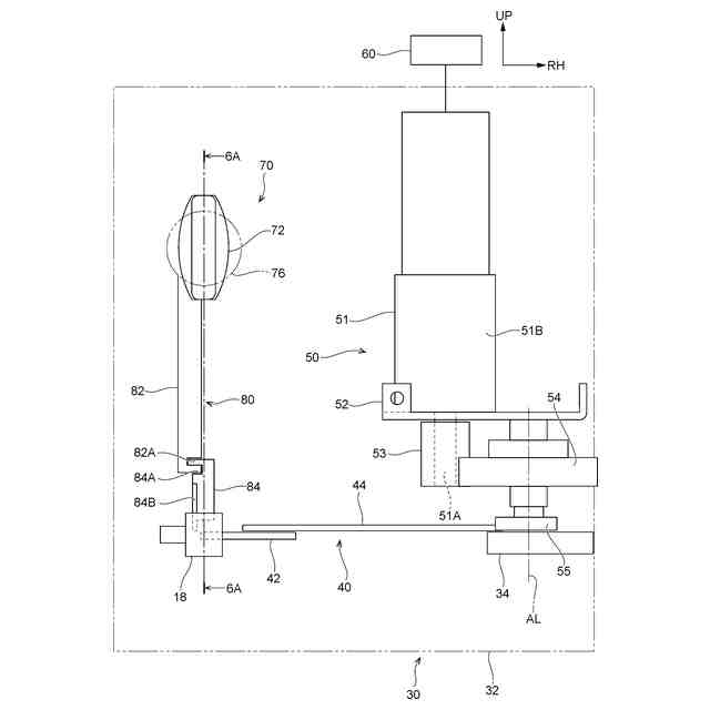 (A)は、図4に示されるクローレバーがアンロック位置に回転した状態を示す断面図であり、(B)は、(A)に示される駆動ホイール及びフォークレバーが回転方向一方側へ回転してアンラッチ位置に配置された状態を示す断面図であり、(C)は、(B)の駆動ホイールが回転方向他方側へ回転して初期位置に配置された状態を示す断面図である。