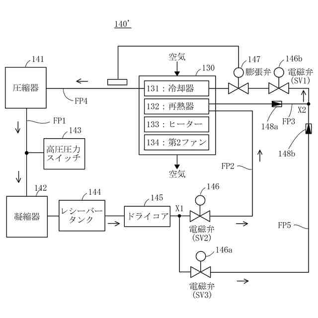 一端が前記第2流路の前記凝縮器と前記第2電磁弁との間に接続され、他端が前記第3流路の前記再熱器と前記第1電磁弁との間に接続された第5流路と、