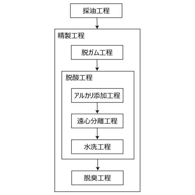 油脂の精製工程は、脱ガム工程、脱酸工程、脱色工程、脱臭工程等を行うのが一般的である。脱ガム工程では、水溶性リン脂質、ステロール、金属、その他水溶性物質等の除去が行われる。脱酸工程では、石鹸分(遊離脂肪酸)、非水溶性リン脂質、色素、金属、着色成分等の除去が粉われる。脱色工程では、色素、石鹸分(遊離脂肪酸)、着色成分、不けん化物、酸化生成物、金属等の除去が行われる。脱臭工程では、有臭物質、石鹸分(遊離脂肪酸)、色素、不けん化物、残留農薬等の除去が行われる。