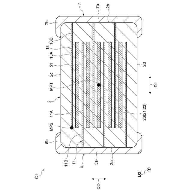 【解決手段】第1内部電極11と第2内部電極13とが、第2方向D2に、素体2と異なる材料からなる異種材料層21を介して対向する。このように、内部電極11,13に加えて異種材料層21を重ねることで、素体2より線膨張係数が大きい部材の体積を増やすことで、内部電極11,13と素体2の側面2e,2fとの間のサイドギャップ部SGに圧縮応力を導入することができる。これにより、電圧印加時に電歪振動が発生しても、サイドギャップ部SGでの第2方向D2における中央部の引張応力を低減することで、電歪クラックの発生を抑制できる。第2方向D2から見て、異種材料層は、内部電極11,13のコーナー部CNと重ならない。そのため、最外層の内部電極11,13におけるコーナー部CNでの応力緩和が可能となる。