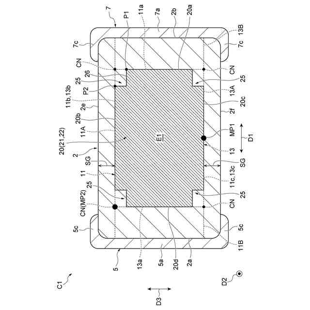 第1内部電極と第2内部電極とが第2方向に重なる領域において、第1方向及び第2方向に直交する第3方向の寸法をWとすると、コーナー部における異種材料層と重ならない領域の第3方向における寸法は、W/10以上であり、W/3以下であってよい。この場合、コーナー部における異種材料層と重ならない領域の広さを十分確保できると共に、当該領域が広くなりすぎることを抑制することで圧縮応力を十分にサイドギャップ部へ導入することができる。