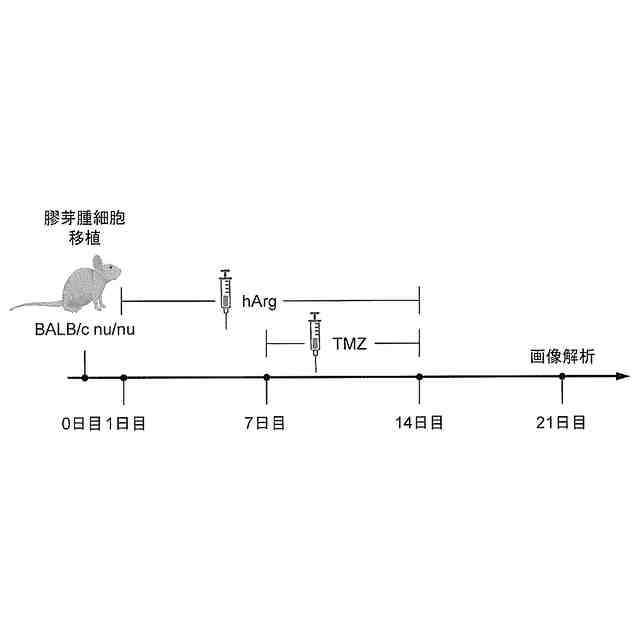 膠芽腫モデルマウスへのホモアルギニン、テモゾロミドの投与スケジュールを示す概略図である。