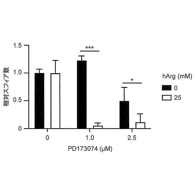 ホモアルギニン(hArg)の存在、不存在下で、PD173074が膠芽腫細胞のスフィア形成に与える影響を示すグラフである。スフィア形成数は、同条件のPD173074非添加時のスフィア形成数を1.0とする相対値として算出した。試験はn=3で実施した。図中、「***」及び「*」は、それぞれ対応のあるスチューデントt検定(片側)において、P<0.001及びP<0.05であったことを示す。