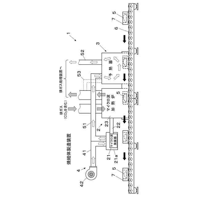 特に上述のような構成は、被加熱物として、石炭灰(例えば、フライアッシュ)にCa源(例えば、廃コンクリート紛)を混合させた混合物を用い、マイクロ波加熱炉において、予熱器で予熱された混合物に二酸化炭素雰囲気下でマイクロ波を照射させて二酸化炭素吸着焼結体を生成する場合においてエネルギーを削減する観点から有用である。