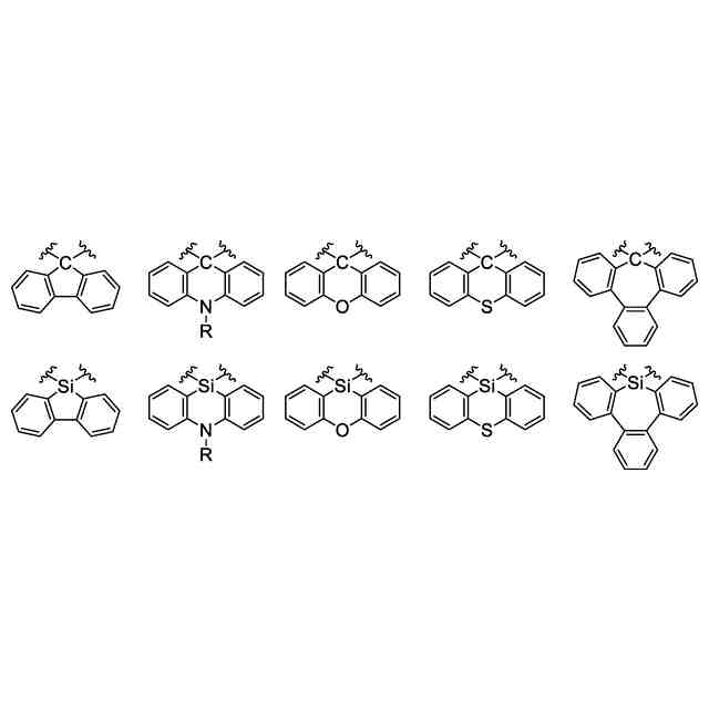 はアリール)、>O、または>Sであり、式(1)におけるアリール環およびヘテロアリール環からなる群より選択される少なくとも1つは、少なくとも1つのシクロアルカンで縮合されていてもよく、式(1)の各元素は、重い安定同位体に置き換えられていてもよい。