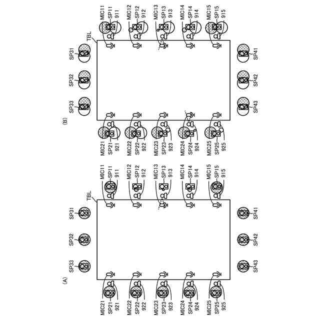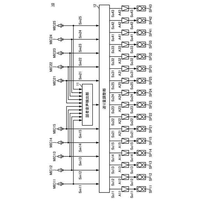 特許文献1は、複数のマイクと複数のスピーカとを備える拡声システムを記載している。特許文献1の拡声システムは、複数のマイクからの入力信号に基づいて話者を検出し、この話者の位置に対応したマイクを選択する。特許文献1の拡声システムは、選択したマイクの近傍に配置されたスピーカの出力レベルを低くする。