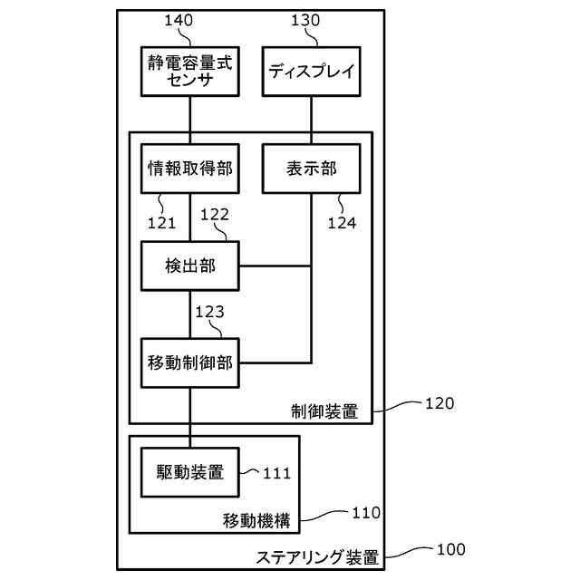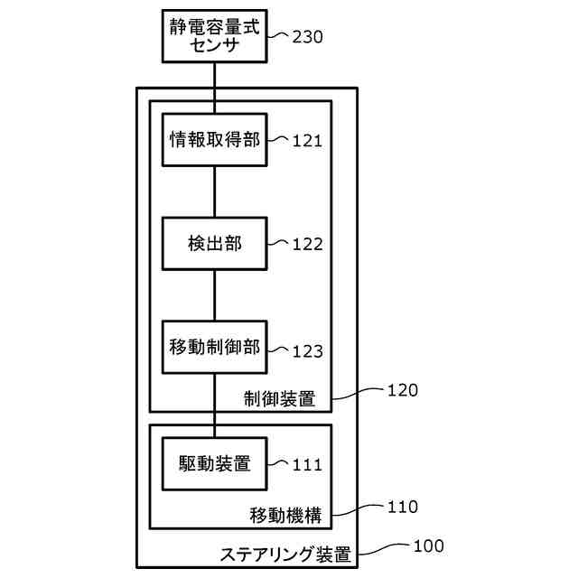 【解決手段】ステアリング装置100は、運転者が操作する操作部材210を、運転者による操作のための位置である通常位置と、通常位置よりも前方の前方位置との間で移動させる移動機構110と、移動機構110を制御する制御装置120と、を備え、制御装置120は、車両の情報や映像を表示するディスプレイ220の表示面に配置される静電容量式センサ230からのセンサ情報を取得する情報取得部121と、センサ情報に基づき前方位置、およびその近傍における手指の有無を検出する検出部122と、操作部材210を前方位置に移動させている際に検出部122により手指が検出された場合、操作部材210の動作を安全動作に切り替える移動制御部123と、を備える。