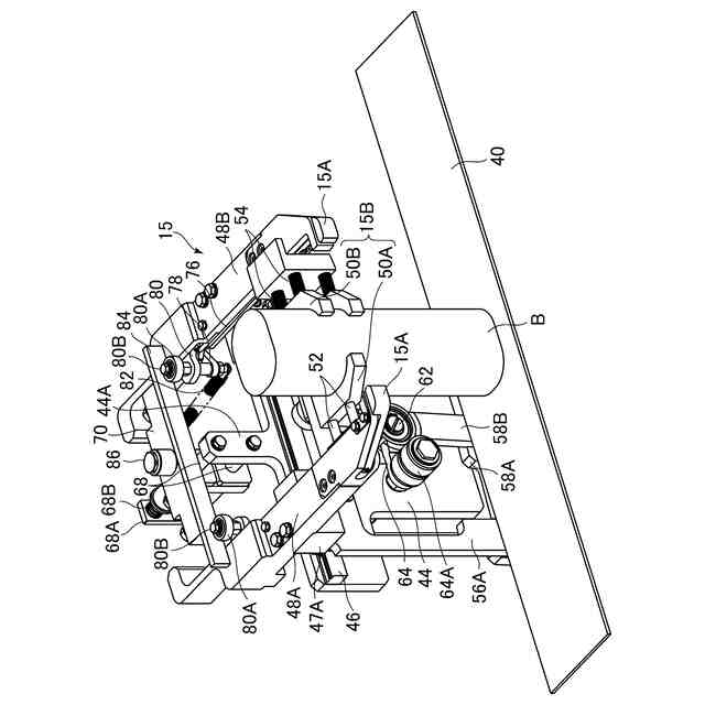 パウチグリッパの開閉動作を説明するパウチ・ボトル兼用グリッパの下面図である。