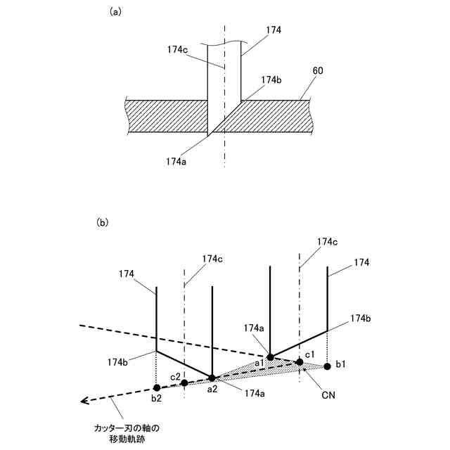 (a)はかす取りカット時の紙の断面を示す図、(b)はかす取りカット時のカッター刃の動きを示す図である。