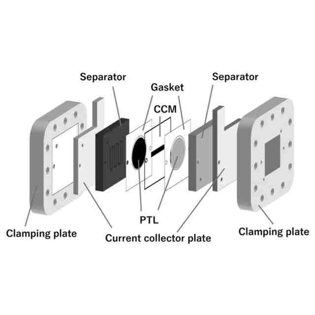 固体高分子形水電解装置は他の水電解装置と比較して、高電流密度運転や応答性、小型化の点で優れているが、電極触媒に希少金属であるイリジウムや白金を利用しているためコストが高い。これまでに水電解装置における水電解槽の低価格化のために、高価な触媒貴金属の非貴金属等への置き換え、あるいは運転条件や水電解槽設計の最適化による高電流密度運転と電極面積の縮小などにより低コスト化が進められてきた。