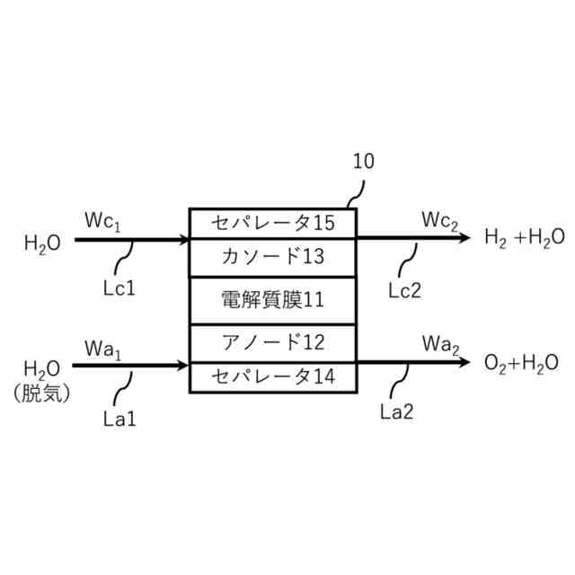 を水電解槽10の外部に放出するカソード側放出ラインLc2と、を備えている。水電解槽10のアノード12及びカソード13には、直流電源が接続され、水を電気分解し、アノード側に酸素ガス、カソード側に水素ガスを発生させる。