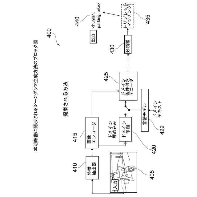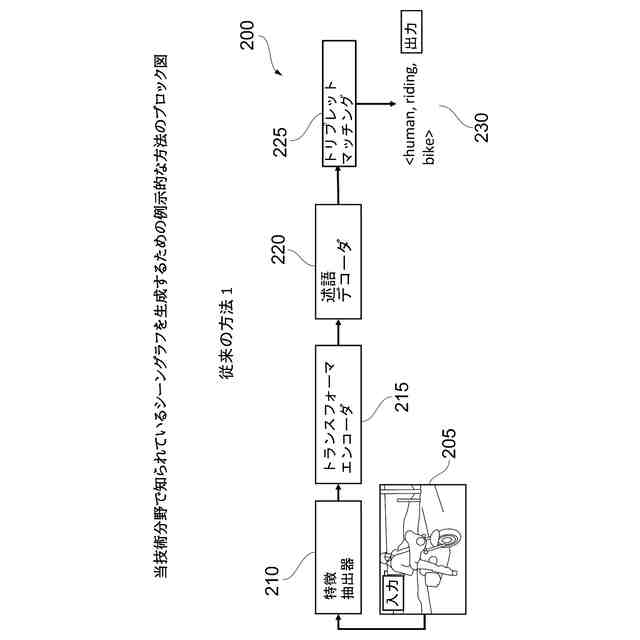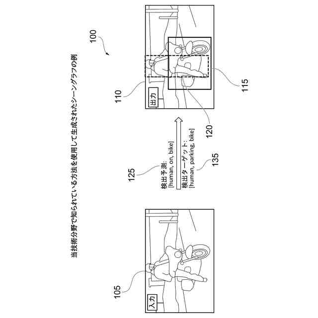 一般的にシーングラフは、少なくとも1つの目的語(又はアイテム)及び少なくとも1つの関係及び/又はアクション(又は「述語」又は「属性」)の特定の組み合わせを示すグラフである。例えば、シーングラフは、画像内の目的語、及びそれらの相互関係を示すことができる。すなわち、シーングラフは、グラフィカルシーンの論理的/空間的表現に対応することができる。dog、人々(people)(つまり、普通名詞)などのシーン内の目的語は、目的語ノードから形成され、目的語間の関係、動作又は記述子、例えば、「looking」、「sitting」、「playing」、「black」、「tall」などの述語は、目的語ノードを接続する述語ノードを形成するか、又は単一の目的語ノードに接続される。幾つかのシーングラフでは、ノードは目的語にのみ割り当てられ、述語は目的語を接続するエッジに沿ったラベルである。