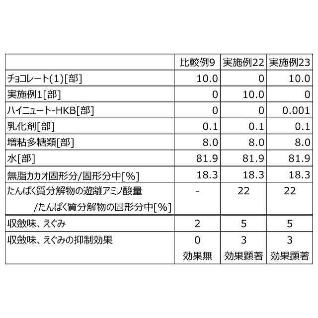 (5)加水分解処理されたたんぱく質分解物を有効成分とする、カカオの収斂味抑制剤、