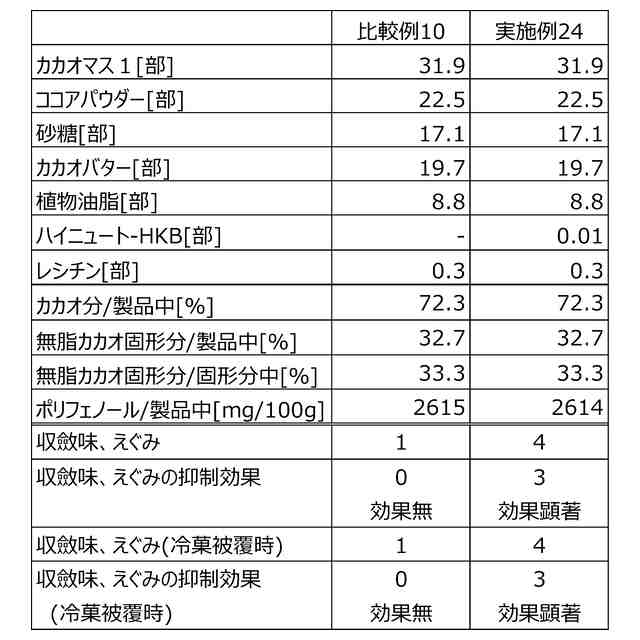 しかし、カカオ由来の健康成分の一つであるポリフェノール類は、収斂味あるいはえぐみなどの風味を感じる場合がある。そのため、カカオ原料を多く含むハイカカオチョコレートはそれらの風味が課題となり、嗜好品として楽しむことが難しい場合がある。