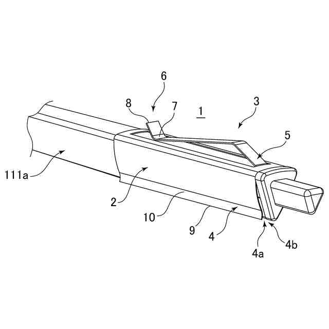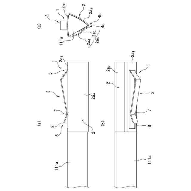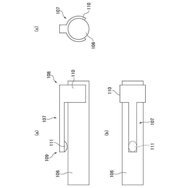 図2図示の取り付け構造では、クリップ107は、長手方向に伸びる棒状製品106に装着される装着部110を備えており、図2図示の例では、装着部110は棒状製品106を抱き込む環状構造になっている。図2図示の例では、クリップ部の基端側108が装着部110取り付けられていて、基端側108から伸びるクリップ部の先端109の側に棒状製品106の方向に向けて付勢されている押さえ部111を備えている構造になっている。