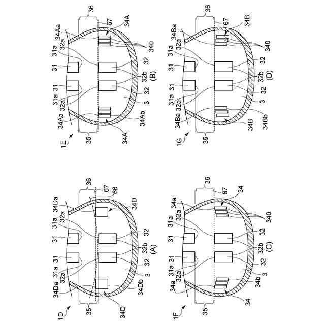 (A)~(D)は変形例に係わる吸収性物品の非肌側面からみた部分拡大平面図である。