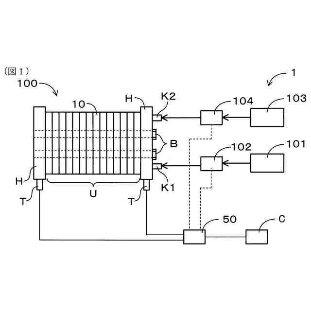 実施形態1では、図1に示すように燃料電池システム1は、燃料電池10と制御装置50とを備える。そして、燃料電池10は、単体セルUとして複数積層されて燃料電池スタック100を形成している。燃料電池スタック100において積層された複数の単体セルUはホルダH及びボルトBによって保持される。燃料電池スタック100には、燃料タンク101に貯留された液体燃料であるギ酸を加圧して供給する第1ポンプ102が配管を介して接続部K1に接続される。また、燃料電池スタック100には、ガスタンク103に貯留された酸化剤(酸化剤ガス)として酸素ガスを加圧して供給する第2ポンプ104が配管を介して接続部K2に接続される。制御装置50により第1ポンプ102及び第2ポンプ104の動作が制御され、電力が外部負荷Cへ出力される。なお、本実施形態1では、発電のために燃料電池10に供給される液体燃料及び/又は酸化剤を「供給原料」というものとする。