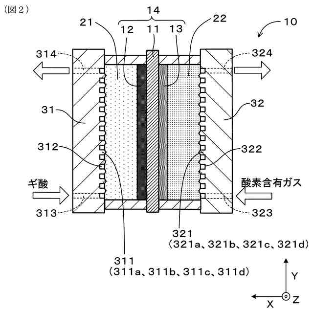 しかしながら、特許文献1に開示の構成では、セパレータにおいて拡散層に接するリブが拡散層に押し付けられることにより、拡散層はリブと接する領域が圧縮変形するとともに、隣り合うリブが梁となって両リブの間の流路に接する領域も圧縮変形する。拡散層が圧縮変形すると拡散層の細孔が潰れて狭くなるため、アノード側の拡散層では流路から供給される液体燃料の流通が阻害されるとともに、カソード側の拡散層では流路からの供給される酸化剤の流通が阻害される。また、両拡散層において圧縮変形された領域には電極反応による副生産物が滞留しやすくなる。これらの結果、発電効率が低下する。また、リブの拡散層への押し付け力が高いと、拡散層の背後の電解質膜を破損するおそれもある。一方、リブの拡散層への押し付け力を弱くすれば拡散層の圧縮変形を低減できるが、拡散層内の抵抗や拡散層とセパレータとの境界抵抗が上昇することにより発電効率が低下する。